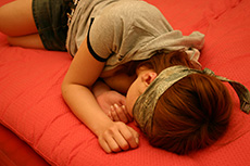 目隠し・両手拘束の状態で襲いかかる男性陣・・・。